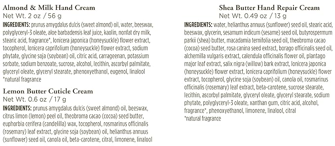 - GIFTS FOR HER: Pamper someone you love with this giftable hand spa kit including Almond Milk Hand Cream, Shea Butter Hand Repair Cream and Lemon Butter Cuticle Cream, plus 1 pair of cotton gloves