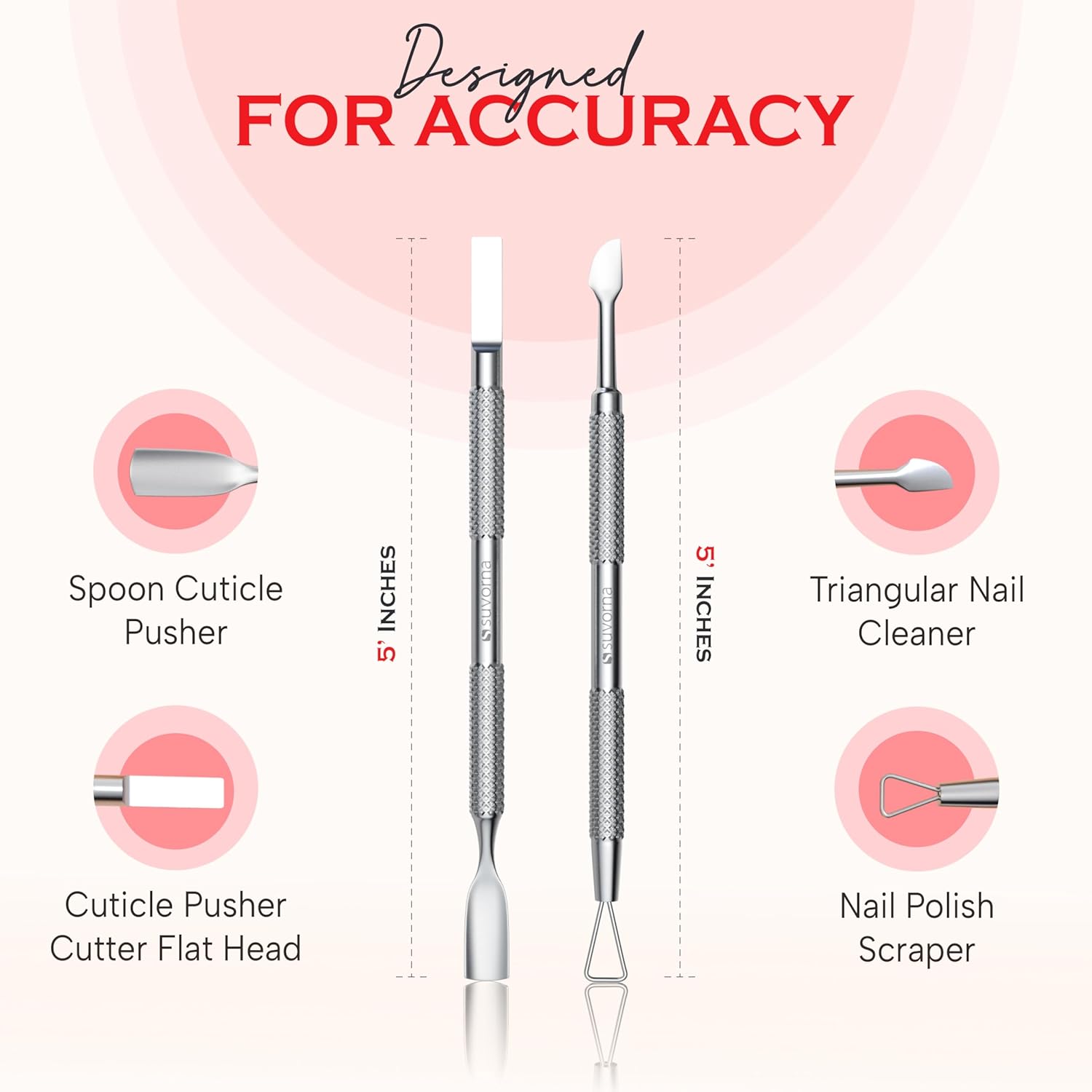 - 👩🏻💼 American Female-Owned Brand – Hand-Finished Excellence: Suvorna is a proudly American, female-owned brand. Unlike others sourcing from China, each cuticle trimmer is hand-finished in our own manufacturing units by skilled artisans using high carbon stainless steel. Ergonomically crafted and hand-polished for precision and durability, our cuticle nippers deliver luxury-level performance with a lifetime warranty against manufacturing defects.