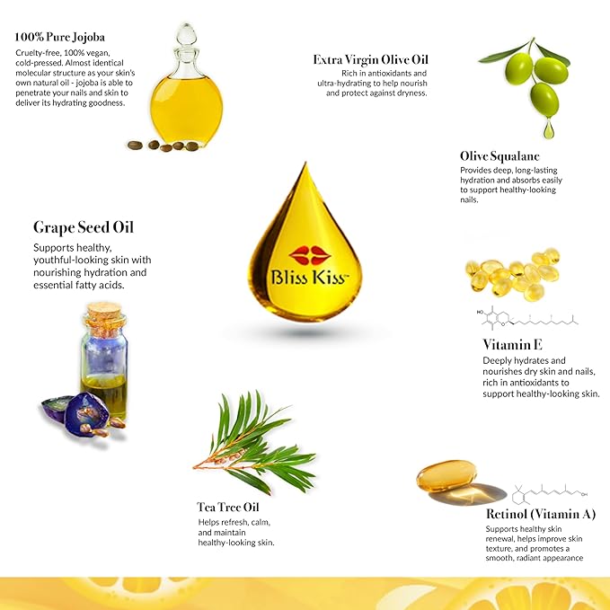 - Bliss Kiss Simply Pure isn’t just for nails—it’s a versatile oil that hydrates and softens skin. A little goes a long way—apply to face, neck, or décolleté for lightweight moisture.