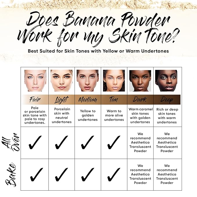 - The Aesthetica Banana Loose Setting Powder helps expertly set freshly applied makeup so it adheres to skin for hours. The universally flattering banana tint tones down any red or pink blotchiness while neutralizing blue under-eye circles.