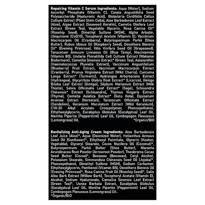 - Key Ingredients: Natural & Organic ingredients, including aloe, DMAE, MSM, Plant Stem Cells, Vitamin C, hyaluronic acid, protein peptides, and caffeine.