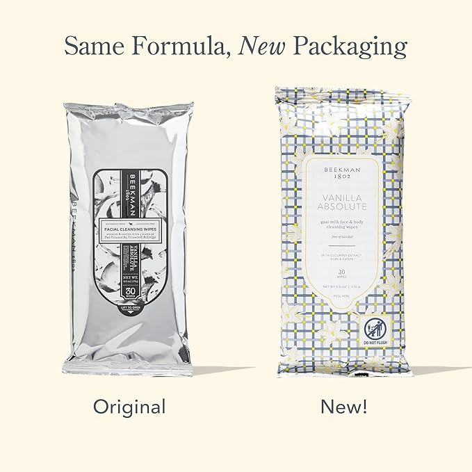 Beekman 1802 Face & Body Wipes, Vanilla Absolute - Scented - 30 Count - Cleanses Dirt & Makeup - With Goat Milk, Aloe & Vitamin E - Alcohol Free, Biodegradable - Good for Sensitive Skin - Cruelty Free