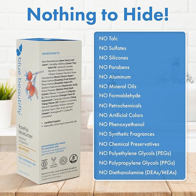 Blue Beautifly Rosehip Face Moisturizer - Restores Elasticity, Boosts Collagen, and Protects the Skin - Hyaluronic Acid Moisturizer Super-Charged with Ribose, and Marine Pine Bark Extract - 2 fl oz