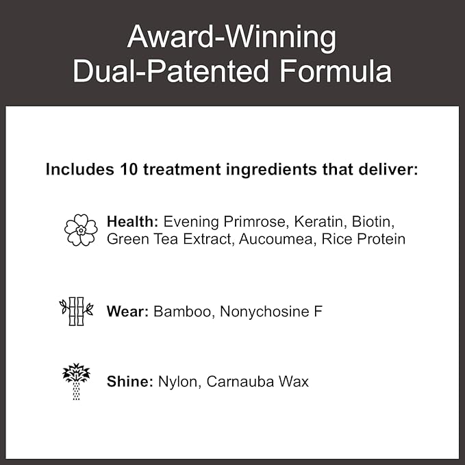 - TREATMENT ENRICHED FORMULA: This dual-patented nail polish formula delivers health, wear and shine with 10 exclusive ingredients to ensure optimum well-being and benefits for the nails. Requires no lamps or tools. These ingredients include Evening Primrose, Keratin, Biotin, Green Tea Extract, Aucoumea, Rice Protein, Bamboo, Nonychosine F, Nylon, and Carnauba Wax.