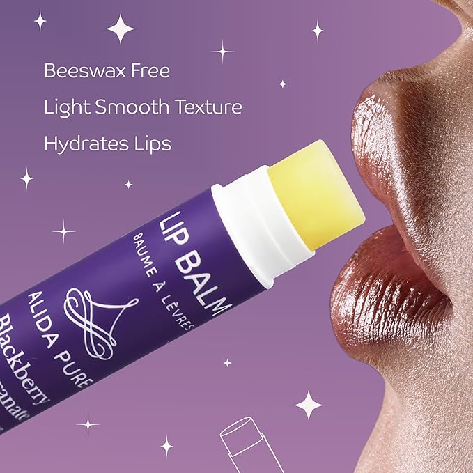 - ALIDA PURE Blackberry Pomegranate Lip Balm Collection, uses avocado oil, and candelilla wax, to protect and nourish. Organic jojoba oil is rich in nutrients, and aids in healing dry chapped skin. Castor oil deeply moisturizes the skin and revitalizes skin cells. With delicious, warm blackberry pomegranate flavor and nutrient packed blackberry seed oil.