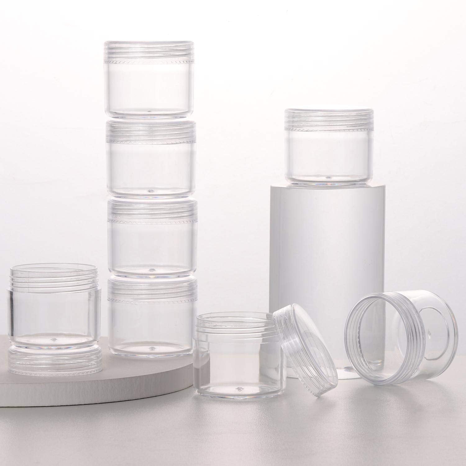 - Quantity: 100 pieces of plastic jars with lids; Capacity: 20g/ 0.68oz. Perfect for storing lotions, lip balms, toners, creams, acrylic powder, and other beauty aids
