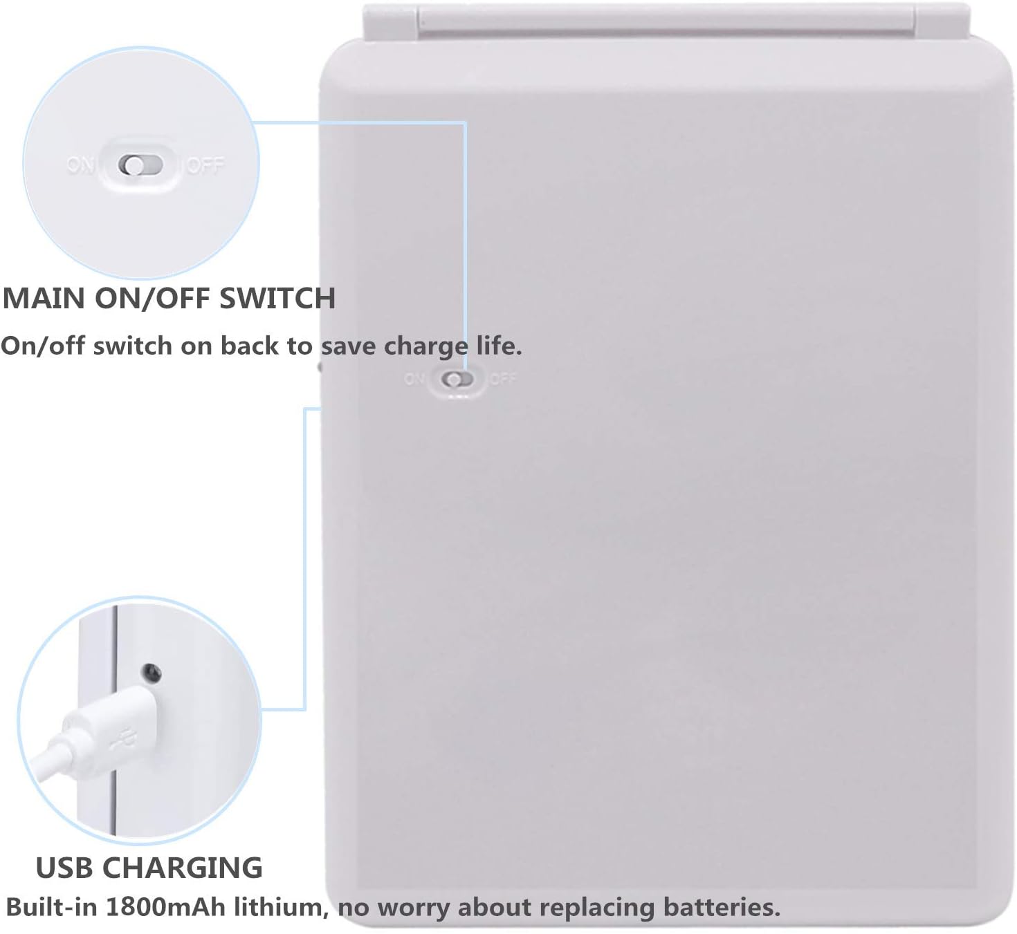 - 【 Rechargeable Illuminated Mirror 】- Built-in 1800mAh lithium battery, connect a laptop, charger or mobile power supply via Micro USB for charging, no worry about replacing batteries. Compact, lightweight, ultra thin and foldable, you can easily put it in your backpack and suitcase, fitting for home, travel or working use.