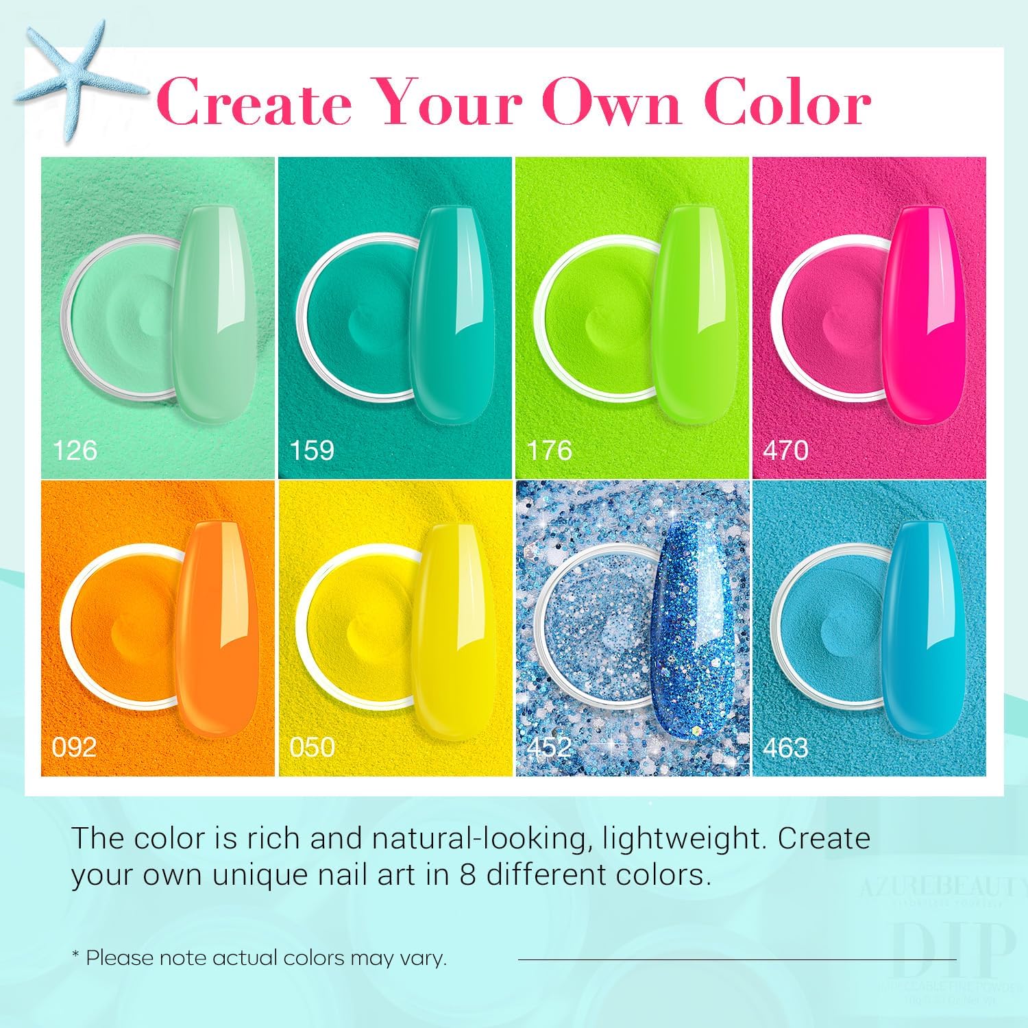 - đăIdeal Gifts & Trusted BrandăNew packaging for AZUREBEAUTY nail dip powder kit with more advanced and simple colors, Ideal gift for your sister, mom, and friends. AZUREBEAUTY offers 18 months of hassle-free and friendly customer service with 90-days of money back. Any questions, please contact us for assistance. (đŁPlease avoid prolonged contact with skin and read the instruction carefully before you use this dipping powder starter nail kit.)