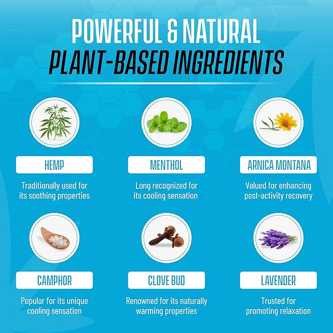 - Natural Plant Based Ingredients: Hemp Seed Oil, Coconut Oil, Candelilla Wax, Shea Butter, Menthol, Arnica Montana, Essential Oils (Lavender, Rosemary, Peppermint, Marjoram, Eucalyptus, Camphor, Clove Bud, Black Pepper) work together to assist with athletic recovery while also moisturizing skin.