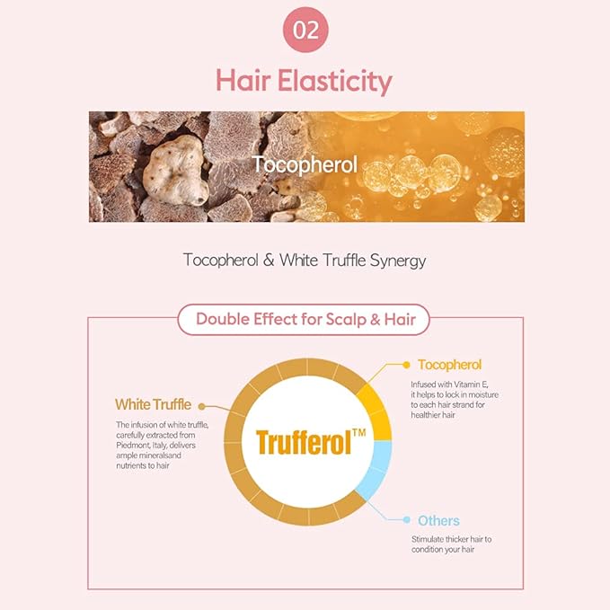 - White Truffles provide high-nutrient care, restoring damaged hair without the use of harsh chemical substances. Various nutrients in Tocopherol including Vitamin E, create a frizz-free, silky shine.
