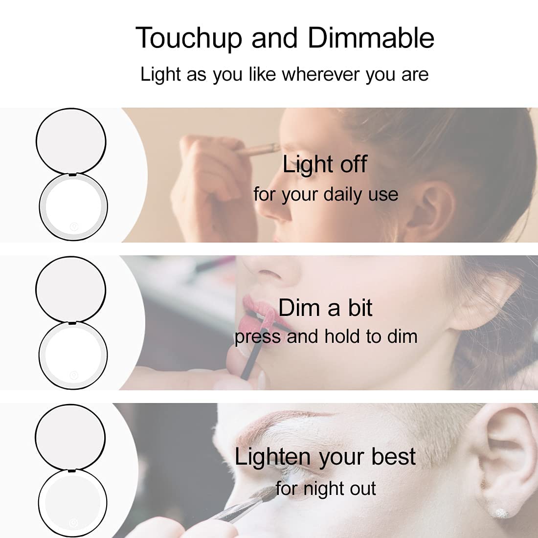 - 【Easy to Use & Compact Size】: Double click to turn on the light; hold and press to adjust the brightness as you need; click once to turn off when you don’t need light. Our LED travel makeup mirror is made of high-quality ABS plastics. The size of the compact mirror: 3.5*0.59in; Weight: 3.25oz can be stored in a handbag, purse or pocket.