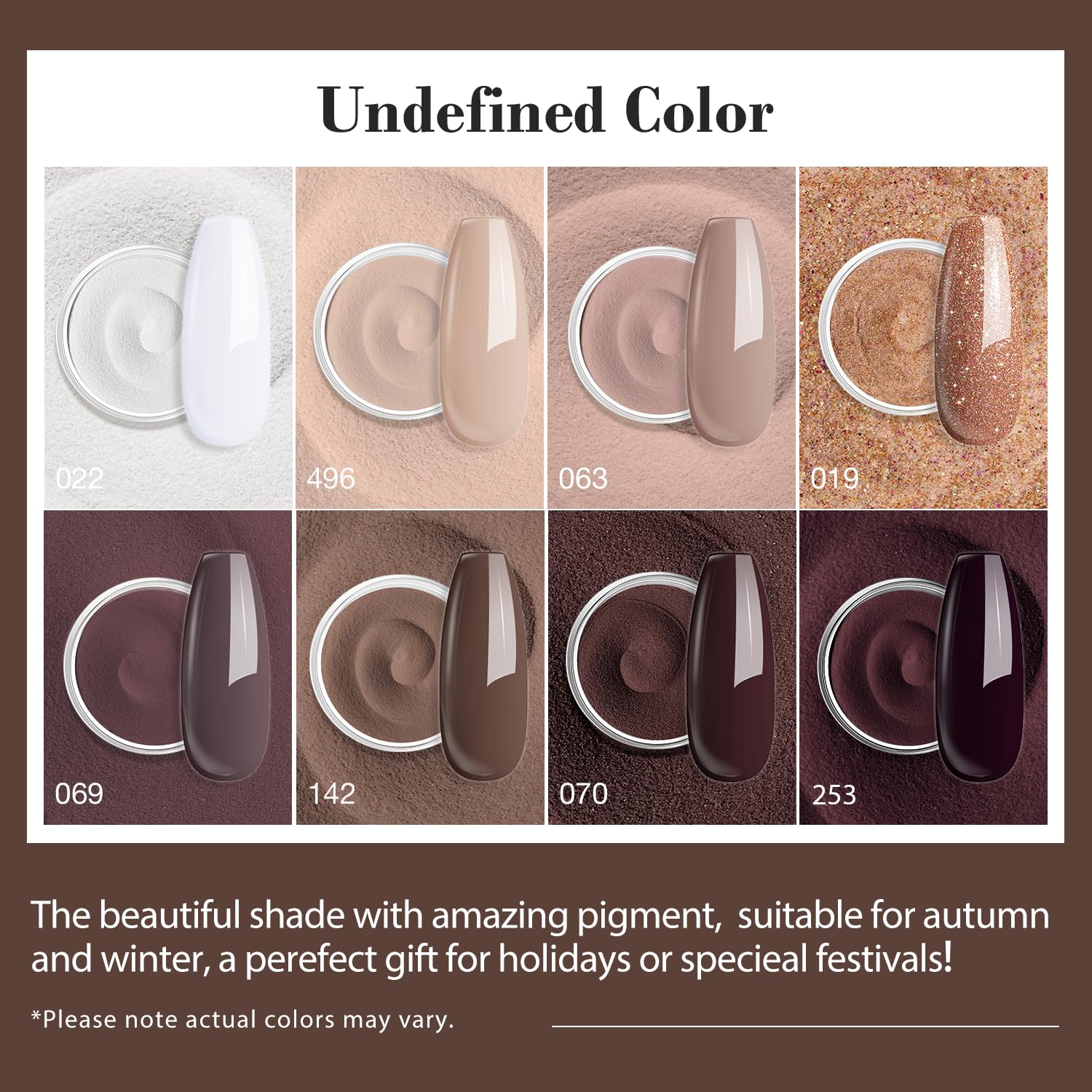 - 【Upgraded 30Pcs Starter Kit】: AZUREBEAUTY 30 Pcs fall brown nude set dip nails powder starter kit: 8*10g (0.33oz) color powder, 4*10ml dip powder liquid set(base coat/activator/top coat/matte top coat), 2*liquid brush replacement, 1*nail brush,1*nail file, 1*nail polishing block, 1*dip powder recycling tray. What's more, 10*nail sticks and 2*orange wood stickers are added in the kit for color testing as well as ease of use