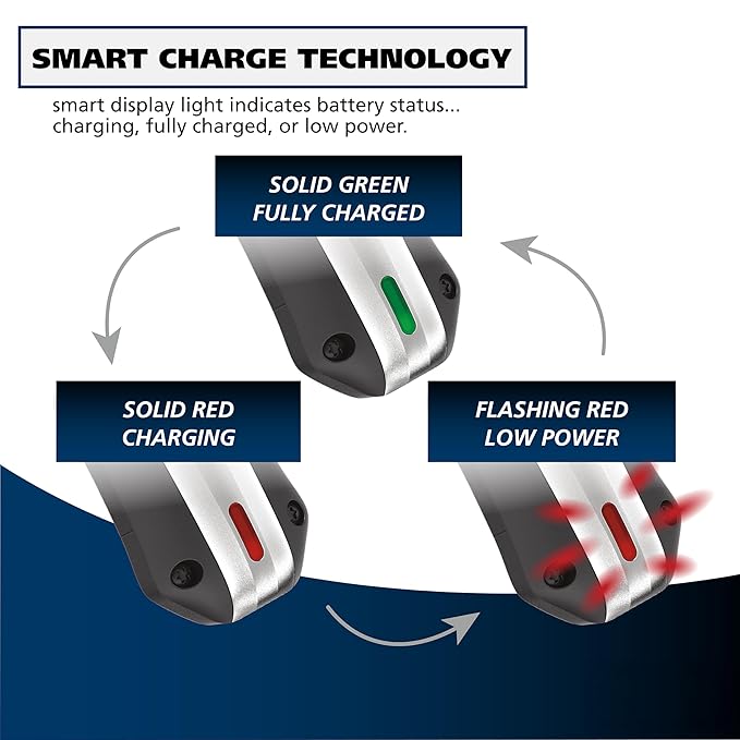 - Smart Charge Technology – Smart display light indicates the battery status from solid green (fully charged), solid red (charging) and flashing red (low power).
