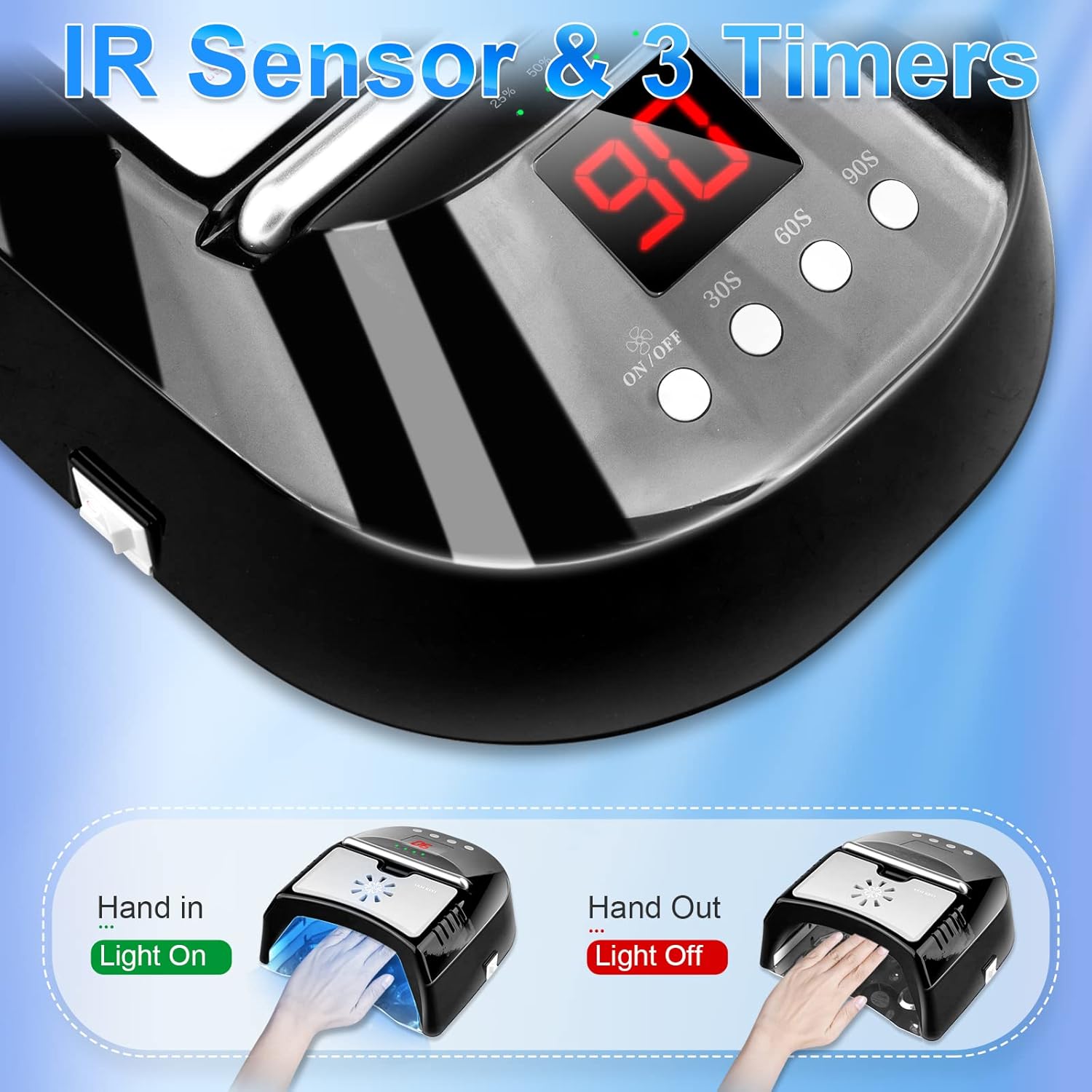 - 【Smart Auto Sensor & 3 Times setting】 This intelligent uv lamp for gel nails has an infra-red auto sensor allows automatically light up and off when you put in/ take out your hands without pressing any button and works for 60s. It is adjustable in 3 timer settings of 30s/60s/90s. Our professional gel UV-led nail lamp equipped with a fan to protect your tender skin from hot and pain when curing gel polish.