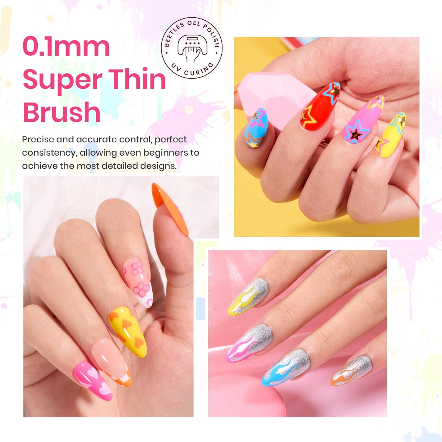 - 【2 IN 1 Top Coat X Liner Gel】:Beetles new upgraded 12 color gel nail art polish set, upgraded original formula, extra pigmented, one stroke glossy finish, requires no top coat after color. Not only can be used as color gel polish, but also can be used for nail tracing, filling, outlining, waves, lines, French, nail painting, etc. Create unlimited possibilities.