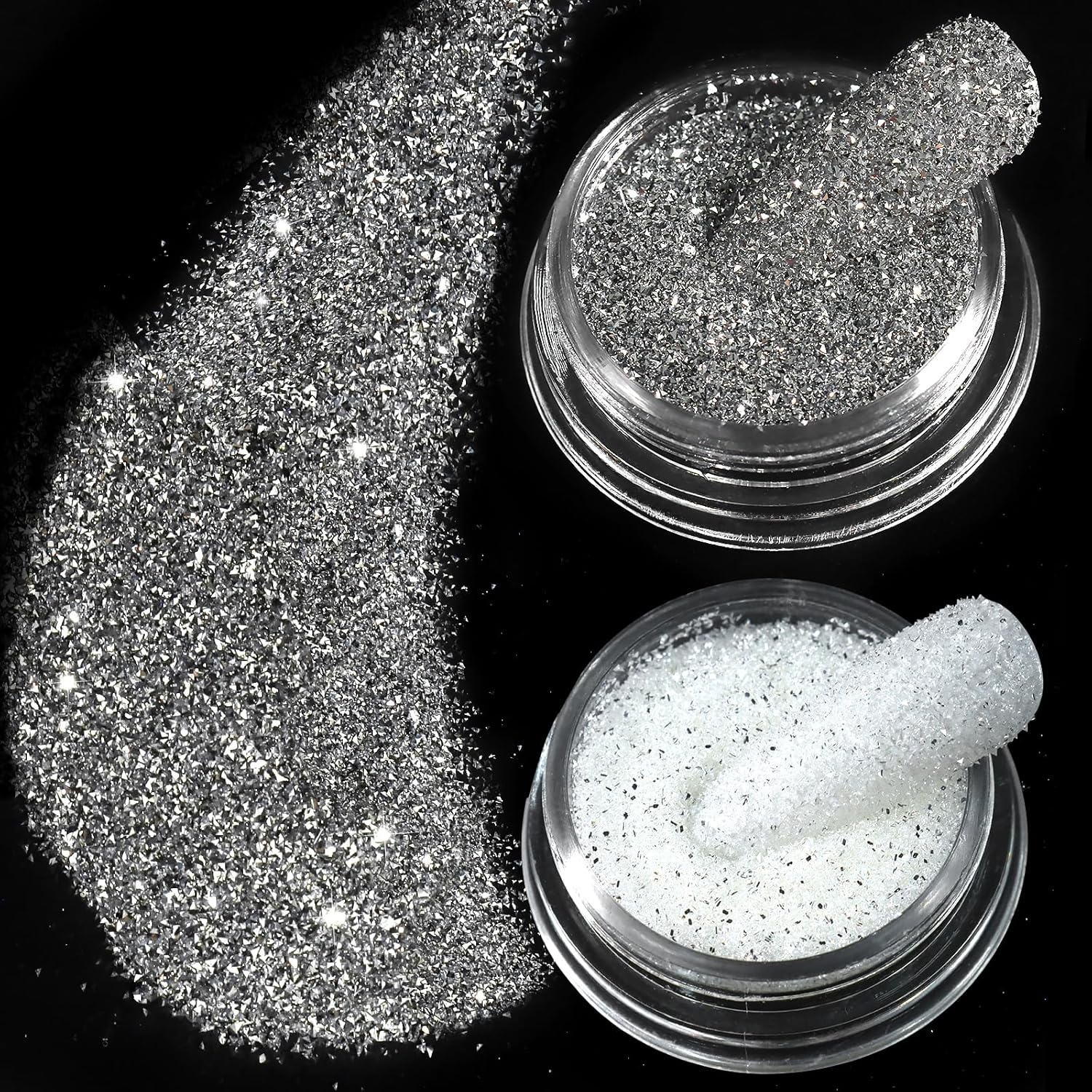 - Two Colors Glitter Set: You will get 2 pot of reflective glitter for nails, the white glitter acrylic powder and the silver nail glitter powder. This nail design kit can satisfy all your need. The nail glitter in silver is so bright and cool, suitable for various nail art designs. The white glitter is a white-clear acrylic glitter, giving a large sparkle sugar glitter for nails and no change color from the gel nail polish.