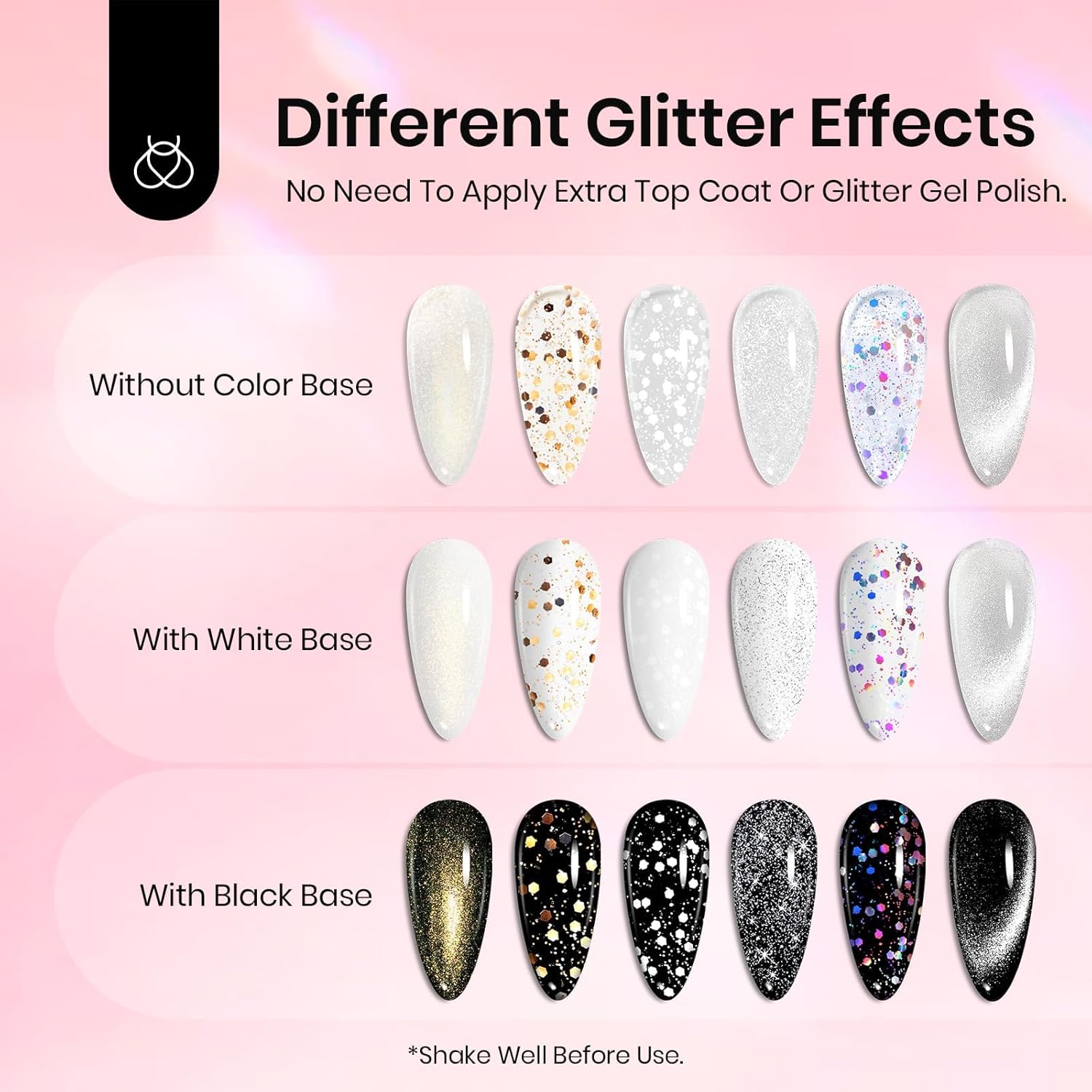- 【Glitter Gel Top Coat for Any Colors】: Formulated with flash reflective powder and holographic particles. Turn any gel polish into glitter and work well with every color. Suitable for nail manicure by using gel polish, poly nail gel, builder nail gel, color base, color nail tips, and so on