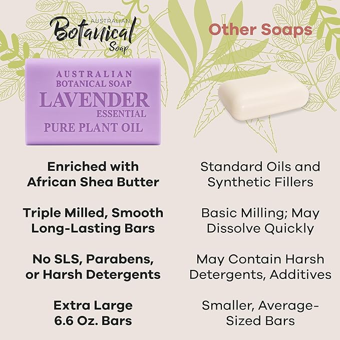 Australian Botanical Soap, 6.6 OZ, Lavender and Essential Oil, Triple Milled Bars made with a Natural Soap Base and Enriched with Organic Shea Butter, Pack of 8