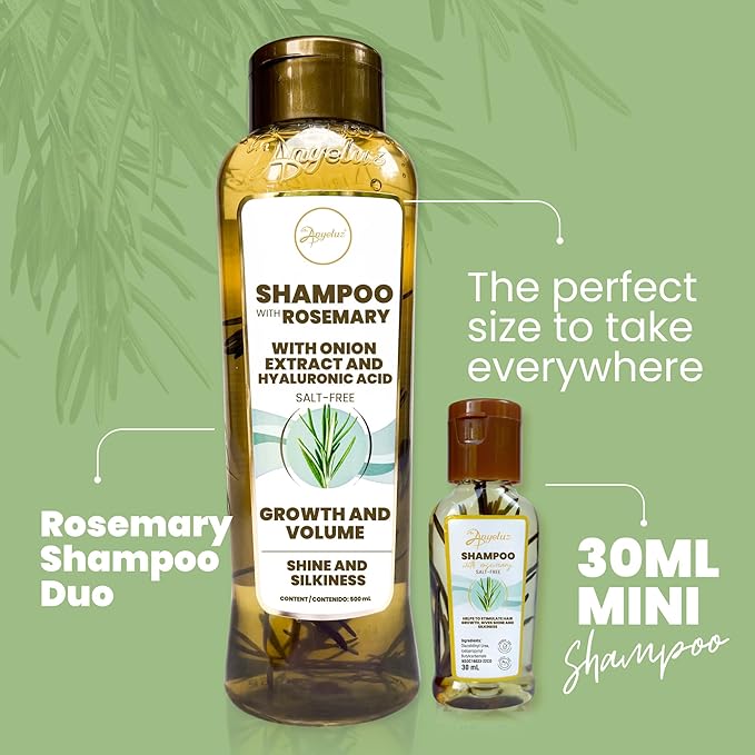 - KIT DUO TRAVEL SIZE, MORE HYDRATED AND STRONGER HAIR: Our duo travel size kit gives you the perfect size to take on all your travels (1oz/30ml) The hyaluronic acid present in the new Anyeluz Rosemary Shampoo provides intense hydration to the hair, preventing it from being dry and brittle. It also strengthens the hair fiber to prevent split ends.