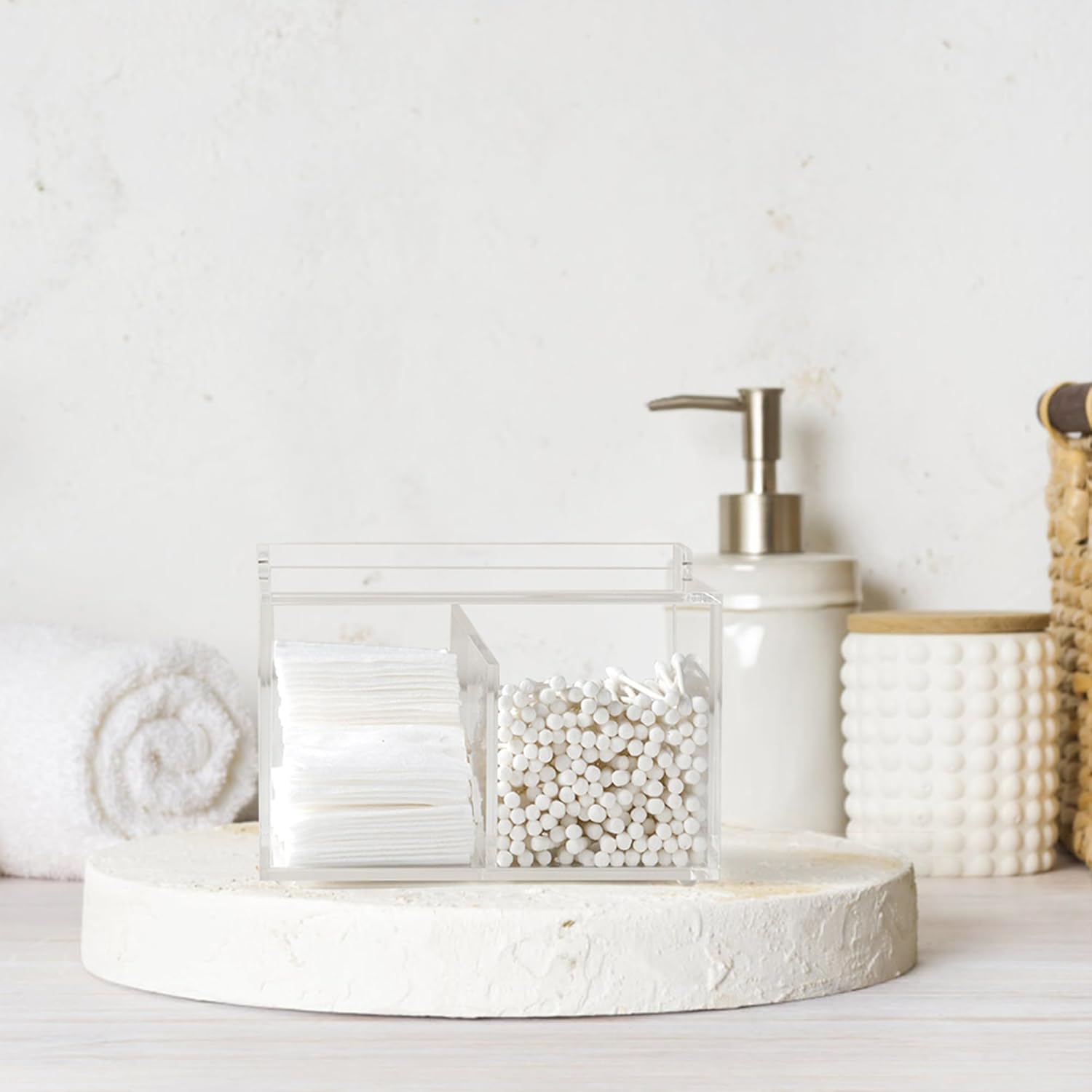 - Unique Design: This cotton ball holder features 2 different compartments and a dustproof lid to keep the items neat and clean. The lid allows you to take the cotton pads out with ease. The crystal clear design makes it a stylish decor for your bedroom, bathroom, office, drawer, and dresser