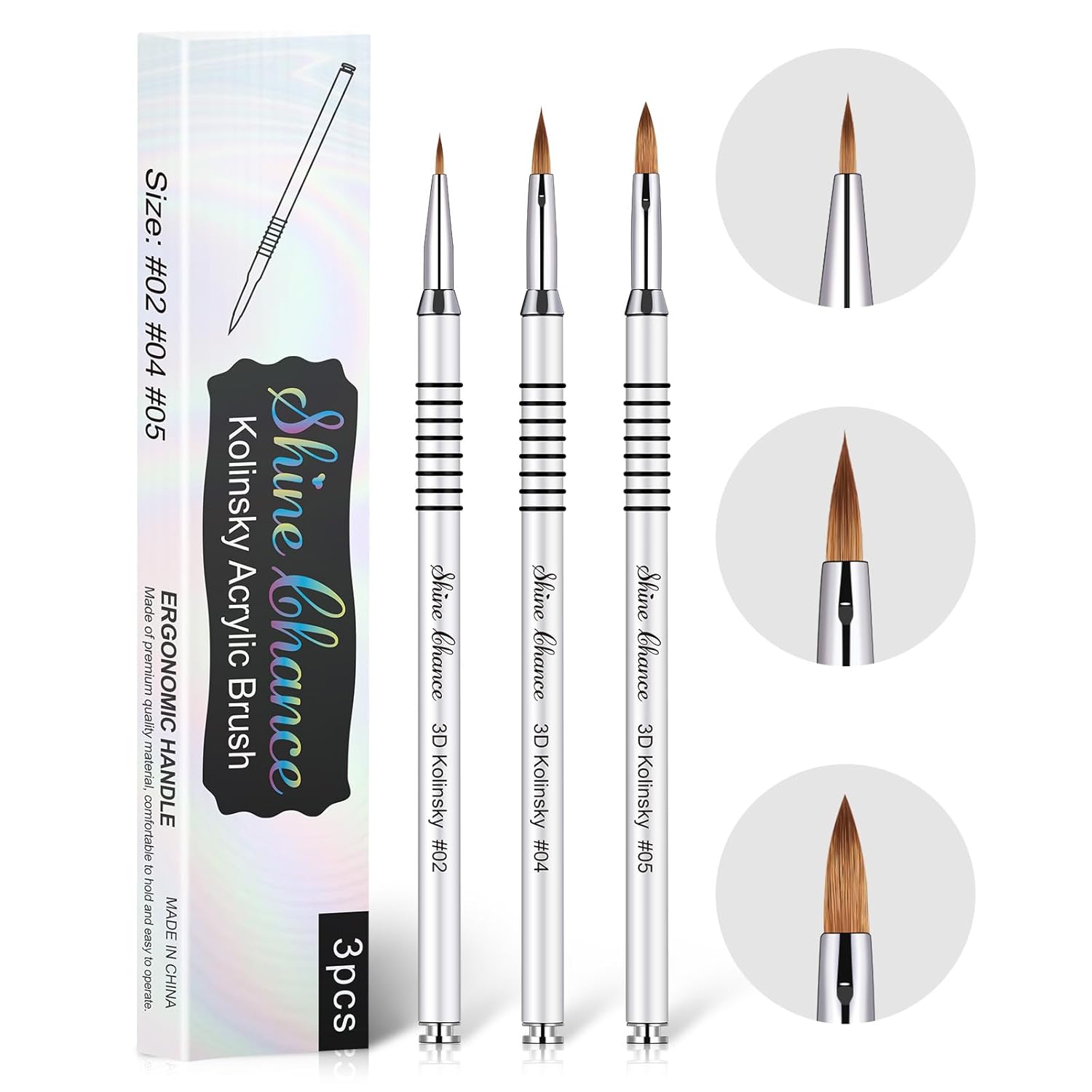 - đ§ââăProfessional Acrylic Nail Brushes Setă: The 3d brush comes with 3 pcs different size silver handle kolinsky nail brushes for art nail, Respectively the size #2 #4 #5. Meets various of different nail art needs. Perfect for acrylic application.