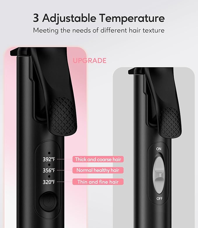 - [3 ADJUSTABLE TEMPERATURE & 100% ANTI-SCALD DESIGN] Farery travel hair curler has 3 adjustable temperature: 320/356/392°F, which meets the styling temperature needs of most hair textures. Small but complete in every detail. The 0.78-inch extra-long (compared to its mini size) tapered cool tip could prevent any potential burn effectively. Also, the safety stand could prevent burning tabletop