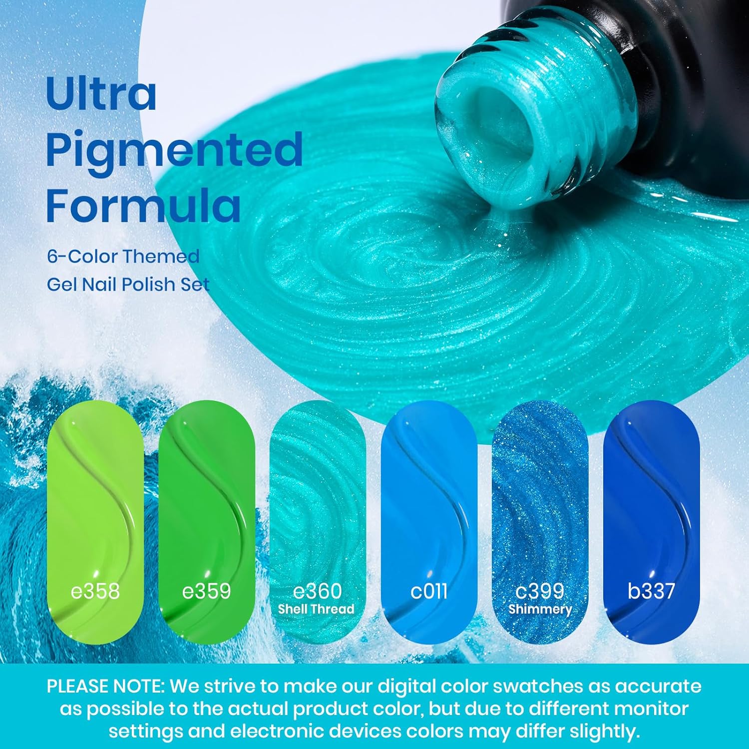 Beetles Blue Gel Nail Polish, 6 Colors Swirl Pacific Blue Glitter Blue Green Gel Polish Swirl Shell Thread Effect Soak Off Nail Art Design Salon Home Manicure Gift for Girls Women