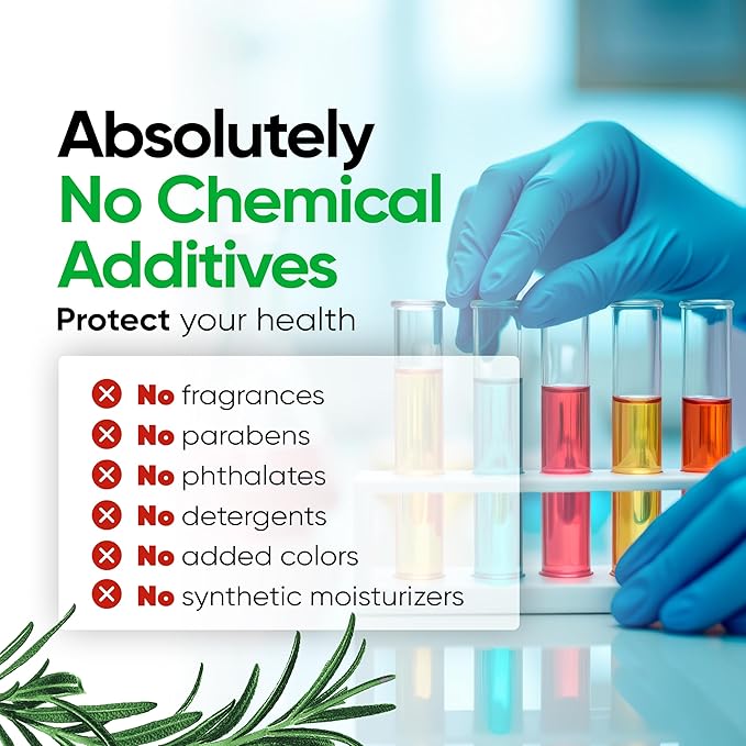 - 🧪ABSOLUTELY NO CHEMICAL ADDITIVES — No toxic chemicals in your body. No detergents, sulfates, added colors, fragrances, phthalates, parabens, or synthetic moisturizers (like EDTA). Your skin is your body's largest organ and the gateway to your body. Take loving and protective care of it.