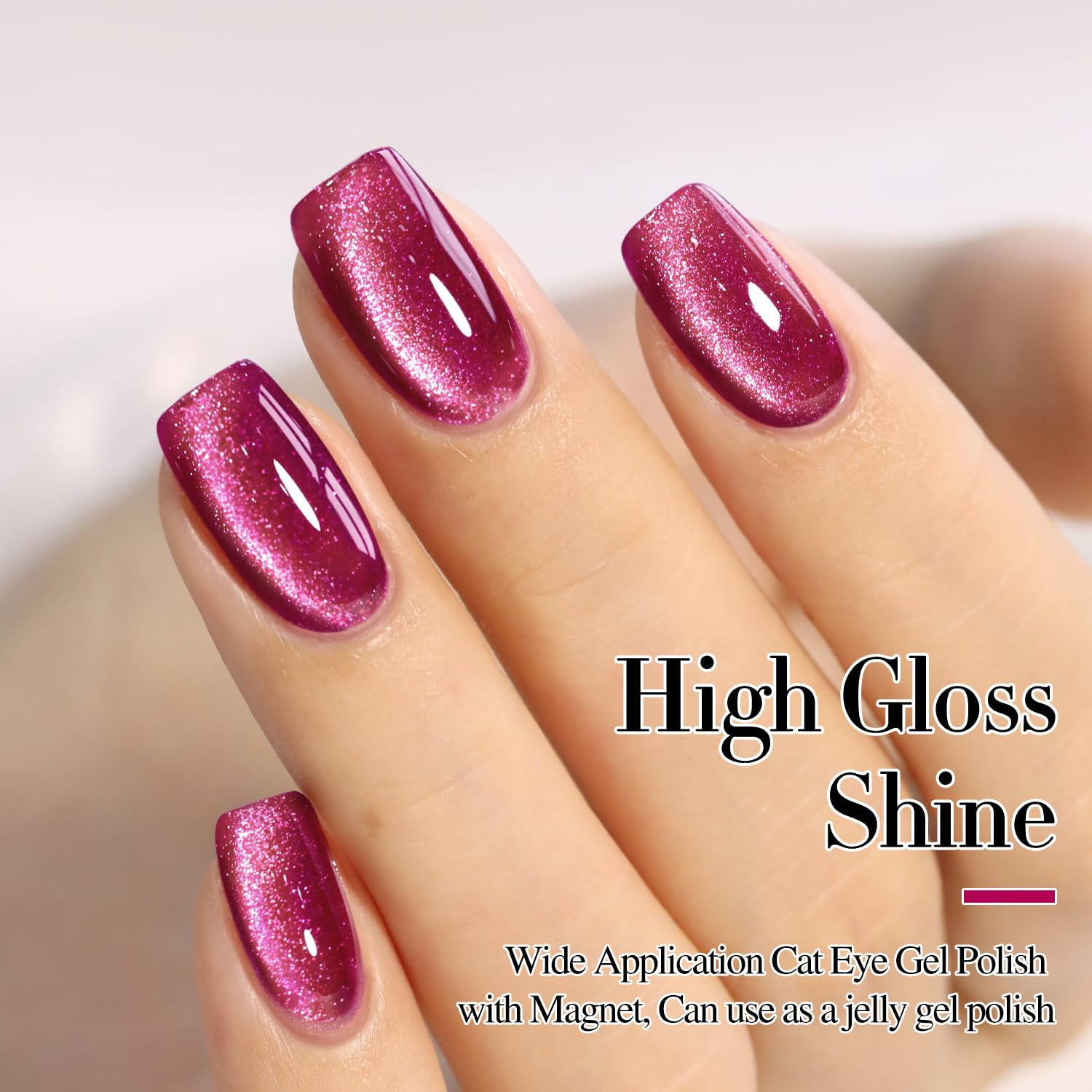 - Cat Eye Gel Nail Polish : Double Rhythm cat eye gel nail polish kit includes 1 color 15ml / 0.5 fl.oz gel nail polish. The cat eye gel can be combined with different bacse colors arbitrarily, you can get different colors nail art.Each kit comes with one magnetic tool for you to create a different cat eye style for your nails.