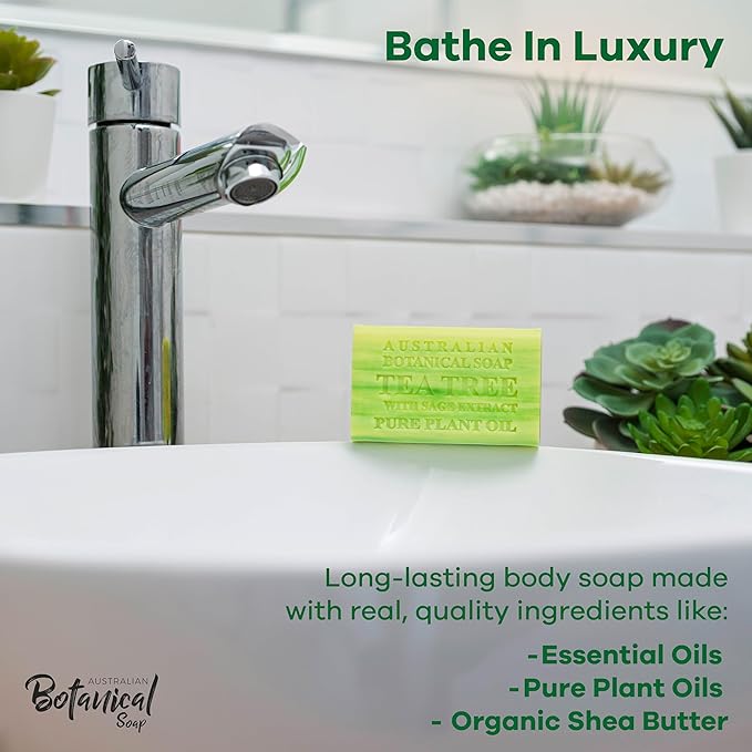 Australian Botanical Soap, 6.6 OZ, Tea Tree with Sage Extract, Triple Milled Bars made with a Natural Soap Base and Enriched with Organic Shea Butter, Pack of 8