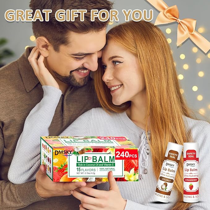 DMSKY Lip Balm 240 Pack, Lip Balm Bulk with Vitamin E and Coconut Oil, Moisturizing Lip Balm for Dry Cracked Lips-15 Flavors