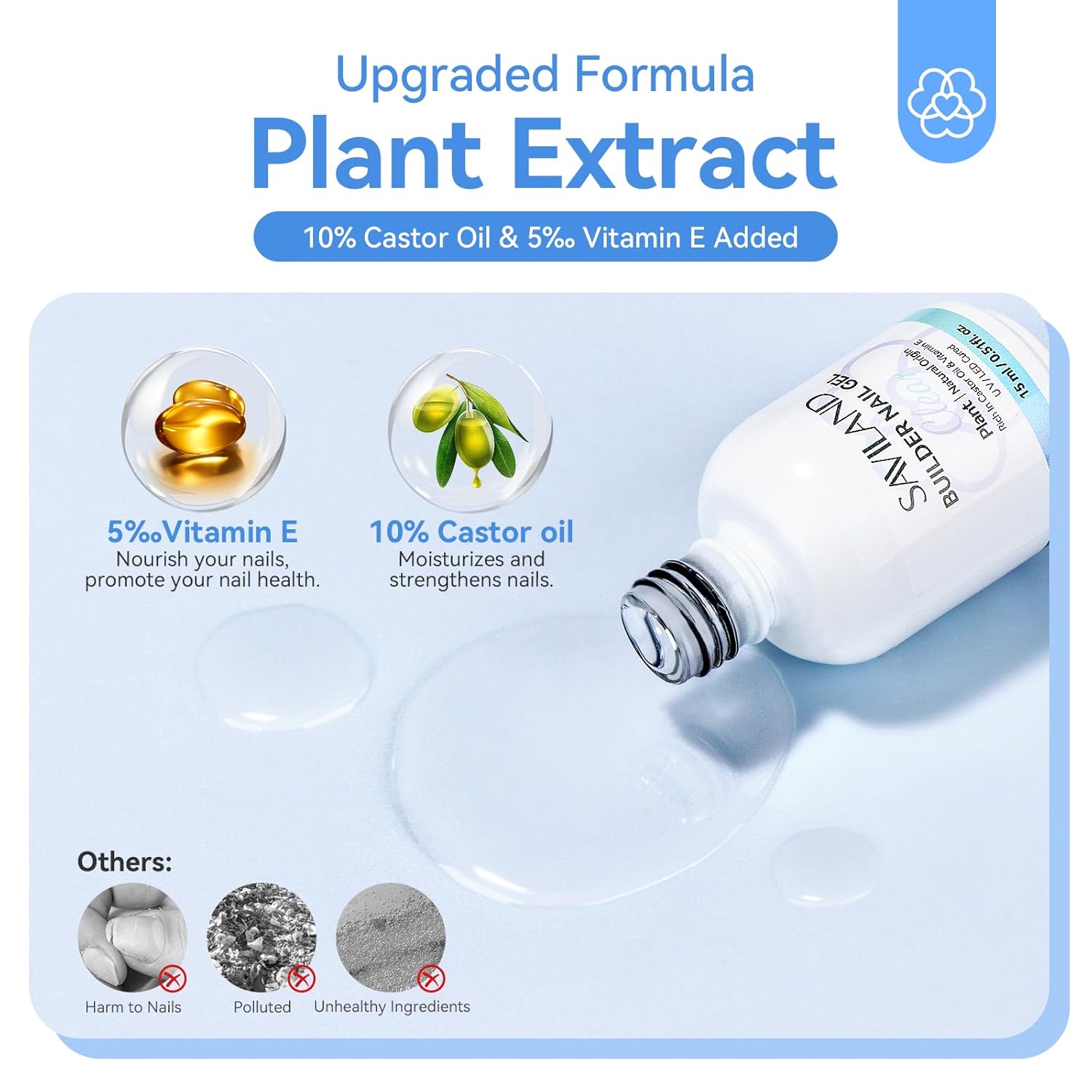 - Rich in Castor Oil & Vitamin E: SAVILAND clear gel builder is added castor oil and vitamin E in the hard gel for nails, foundation gel and top gel, which is the most significant advantage of our new version of nail strengthener gel. While enhancing nails, it can also help moisturize, shine, protect, and promote healthy growth of your nails. Not just staying on a single track like nail design
