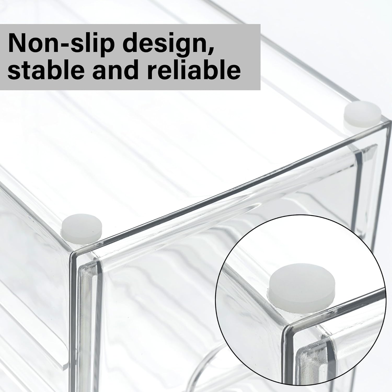 - Unique Design: The clear design of makeup storage allows for easy identification of contents. Made from durable, unbreakable plastic, they are equipped with silicone anti-slip pads on the bottom to prevent movement when the drawer organizer storage is opened or closed, ensuring a steady and reliable storage solution.