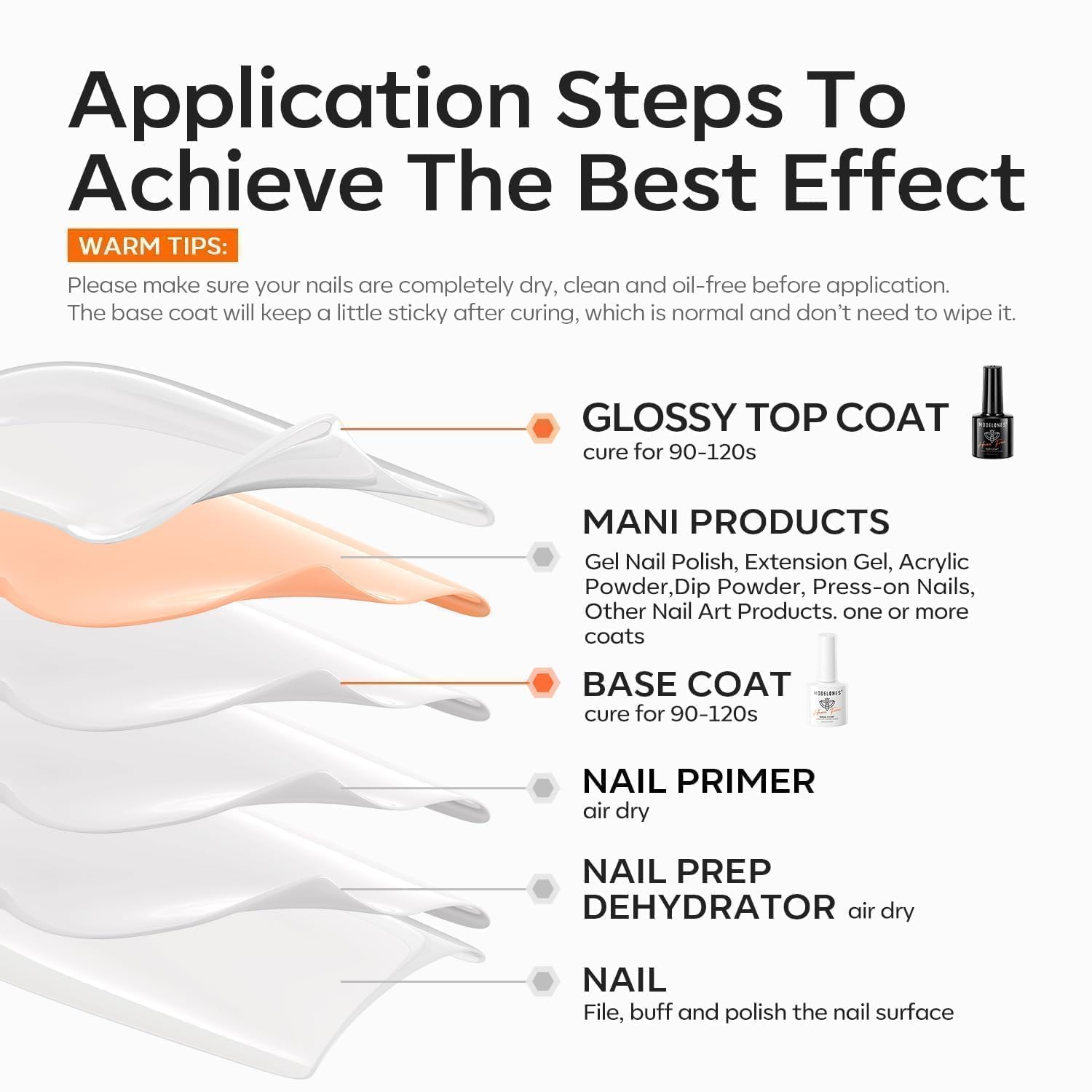 - Versatility: Modelones clear gel nail polish is compatible with various nail art needs, such as gel polish, acrylic nails, dip powder,poly extention nails, press on nails, nail tips, chrome powder, gel x, etc. Use manicure products from Modelones for best results.