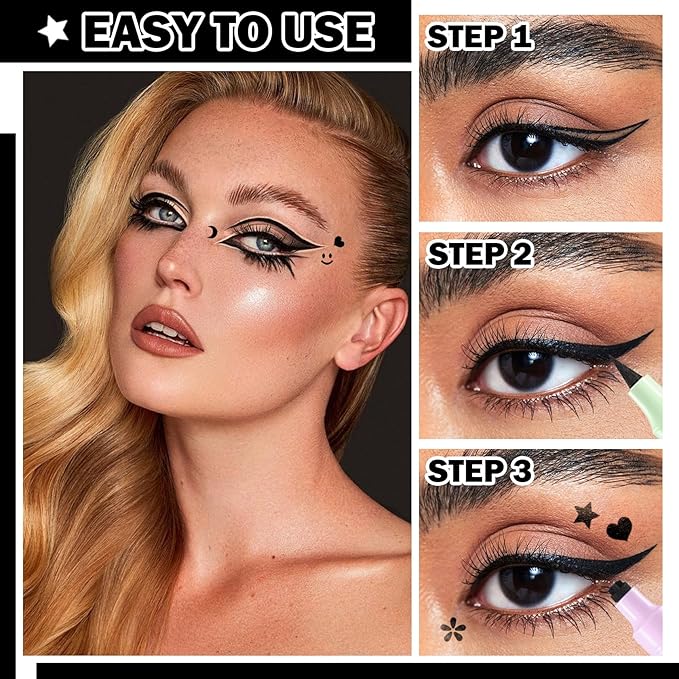 - ✅ 【Dual Tip Use】Liquid eyeliner adopts a very easy to use dual tip design, one end is a fine and delicate soft black eyeliner, the other end is a patterned tattoo eyeliner stamp pen, a variety of vivid and lovely patterned stamps can be used to decorate your eyes, which can make you more attractive.