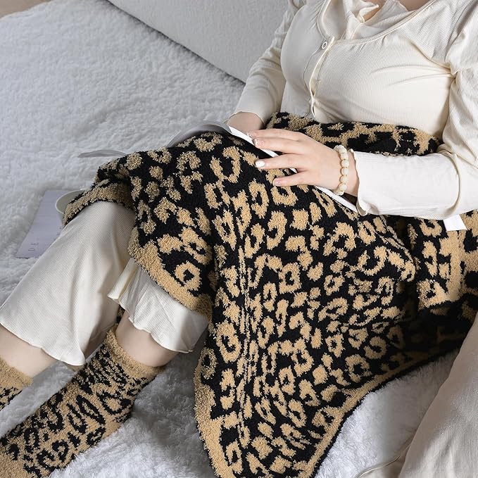 - Feather Yarn Blanket & Fuzzy Socks - 32"x48" Travel blanket, luxuriously soft blanket with leopard knitted pattern. Lightweight and breathable blanket for couch, easily carry with you wherever you go. And one size soft socks fits all womens' feet. Perfect girls gift for cozy nights in or travel.