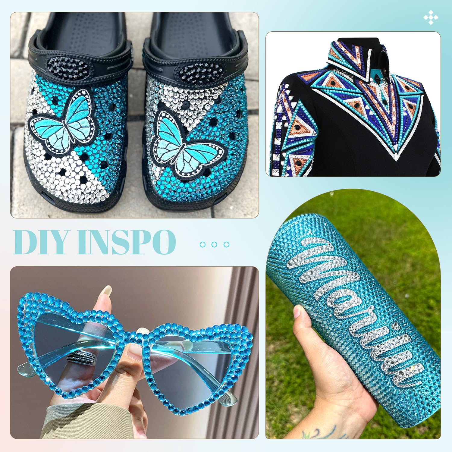 - 💎WIDE APPLICATION -- These sparkling iridescent resin crystals are perfect for creating dazzling looks. Use them for bedazzling DIY crafts like shoes, tumblers, mugs, bottles, phone cases, popsockets, scrapbooks, photo frames, diamond paintings, greeting cards, bags, glasses, guitars, keychains, hats, masks, hair clips, bracelets, wristbands, clothing, wedding dresses, and more. Apply it to what you want to bling!