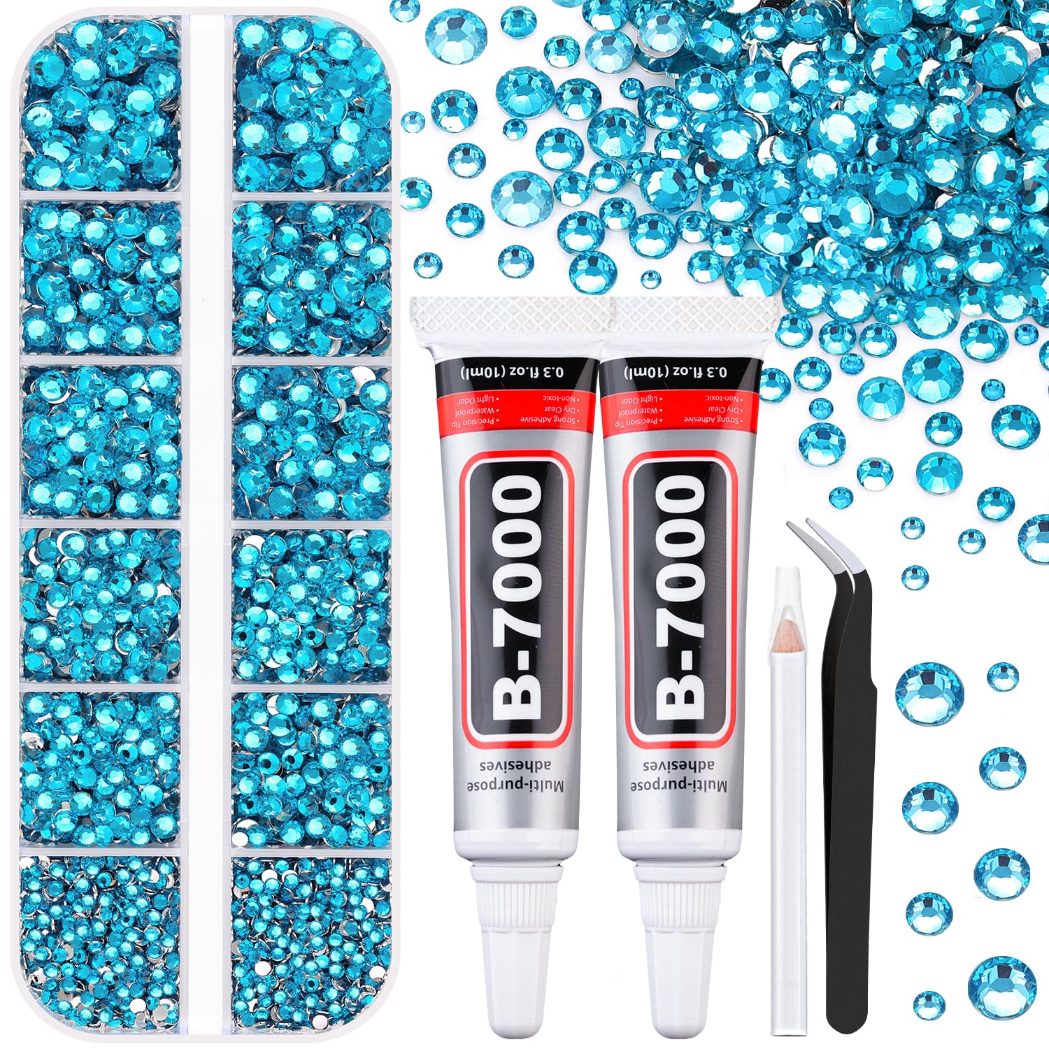 6100Pcs Resin Rhinestones for Crafting with 2Pcs 10ml B7000 Jewelry Glue, 1 Box Flatback Crystals Diamond (Indicolite) for Bedazzling Crafts DIY Nail Art Non Hotfix Gems for Clothing Shoes