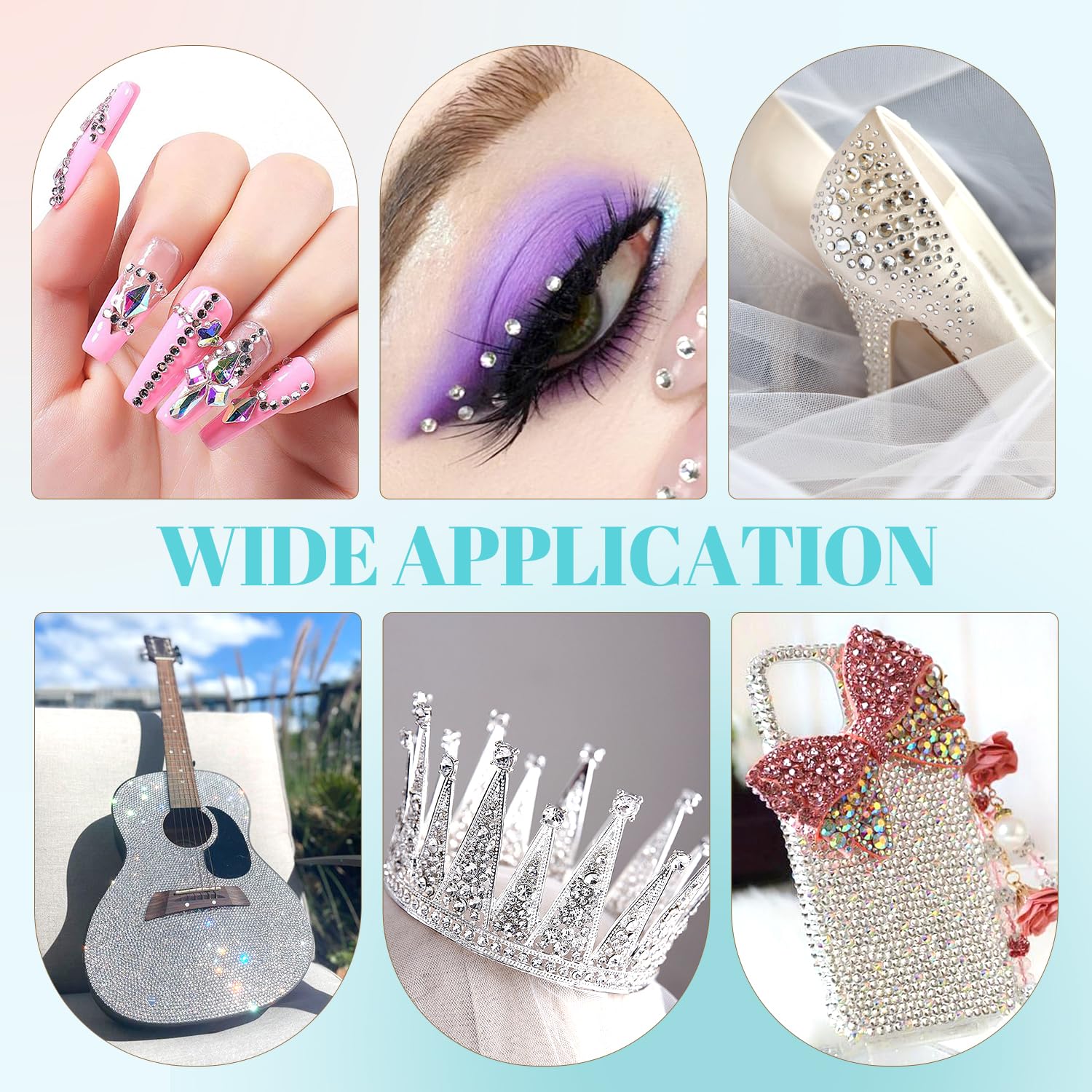 - 💎WIDE APPLICATION -- These sparkling iridescent resin crystals are perfect for creating dazzling looks. Use them for bedazzling DIY crafts like shoes, tumblers, mugs, bottles, phone cases, popsockets, scrapbooks, photo frames, diamond paintings, greeting cards, bags, glasses, guitars, keychains, hats, masks, hair clips, bracelets, wristbands, clothing, wedding dresses, and more. Apply it to what you want to bling!