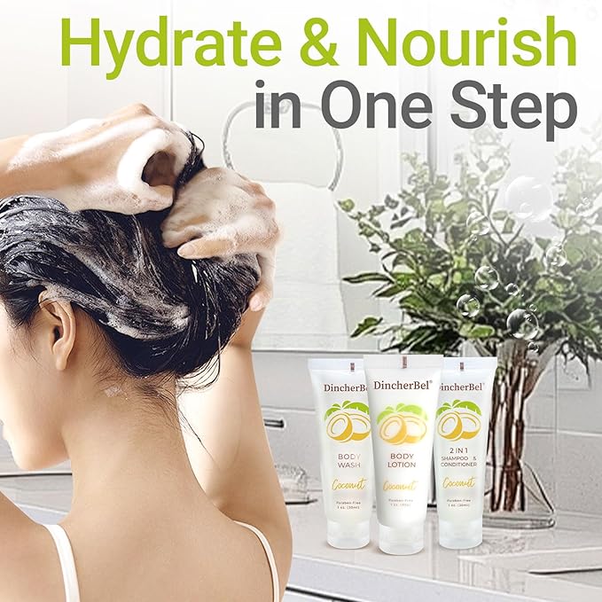 - HOTEL TOILETRIES SET INCLUDES: 50 pieces travel size shampoo & conditioner 2 in 1, 50 pieces travel size body wash and 50 pieces travel size body lotion individual packaging tubes (1 Fl oz, Coconut Scent)