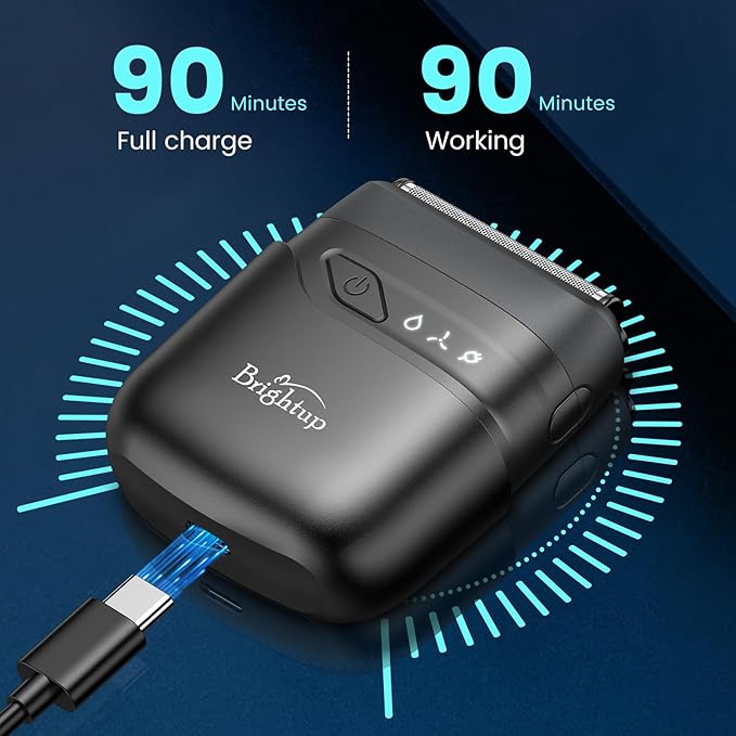 - Specifically Design for Travel: Brightup travel electric shaver is designed with a protective cap that also covers the power button as well so it will never turn on. Also, the USB Type-C makes it easier to charge it via your phone's brick or a power bank – the perfect tool to be a travel companion! Come with a mini storage bag, easy to store a mini shaver, and a USB-C cord, helping you travel light.