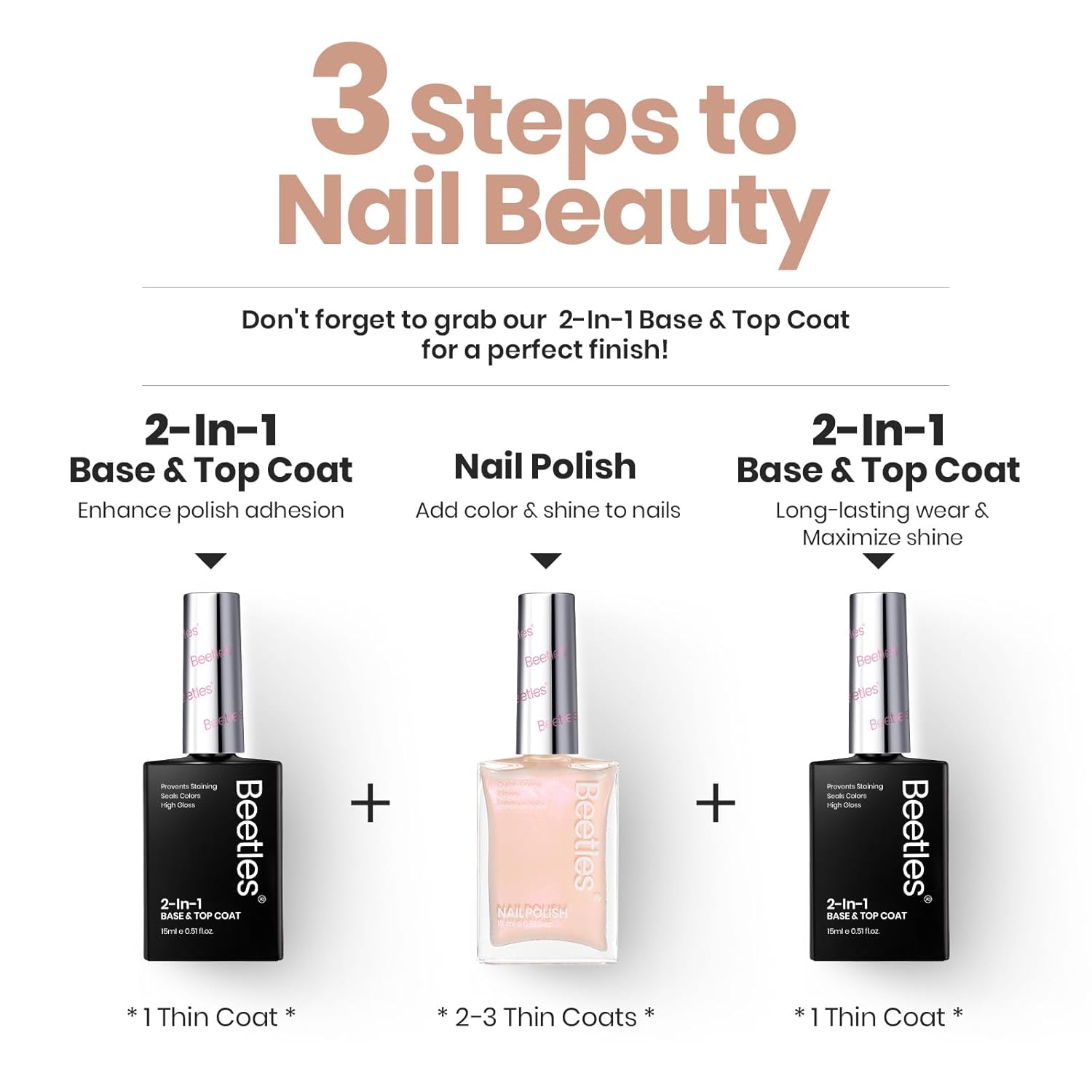 - 【Health & Beauty】Beetles 2 in 1 Nail Strengthening Polish free of 12 common harmful formulas, not only does it make no harm to the nails, but the nutrients in it also speed up nail repair. (Tips: Base coat & top coat are required! This item does not include base&top coat, which needs to be purchased separately.)