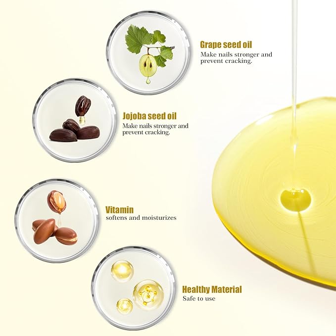 - 【Moisturizing】 Our Cuticle Oil for Nails and Toes is specially formulated to hydrate and relieve cuticles after manicure and pedicure procedures. Pure natural jojoba seed oil and grape seed oil extraction are both rich in vitamins and proteins. this cuticle oil deeply nourishes, leaving your cuticles soft and hydrated. Ideal for daily use, our cuticle oil helps prevent dryness and cracking, keeping your nails looking perfect and well-maintained.