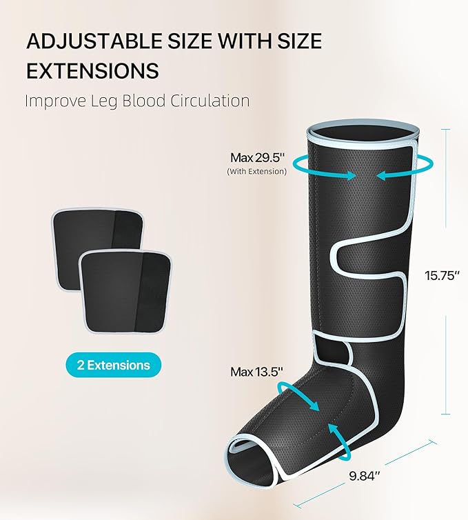 - 2 EXTENDERS - ONE SIZE FITS MOST: This foot and leg massager can wraps nicely around your calves [up to 29.5“] and feet [up to 13.8”]. Comes with 2 extenders, the size is very inclusive and can fit a wide range of leg sizes, making it ideal for home use and ensuring a comfortable fit for everyone in the family