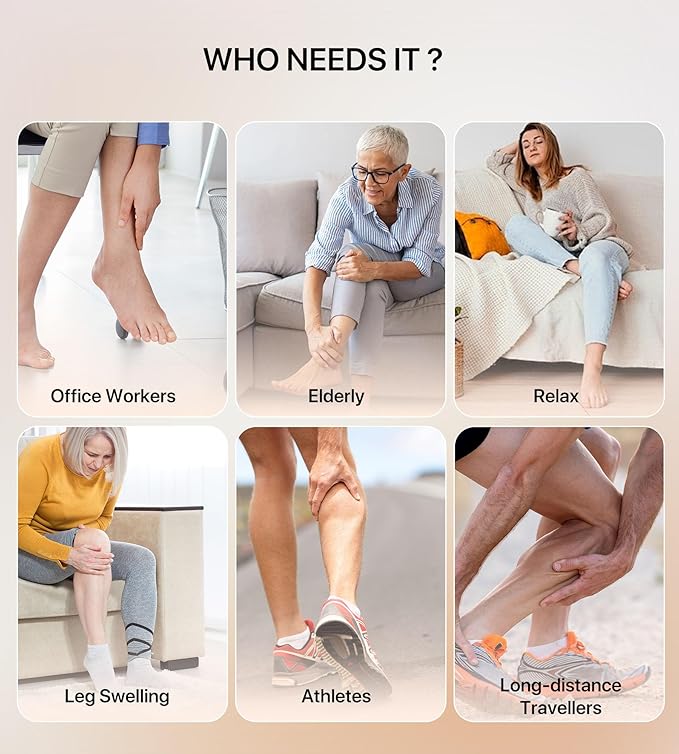 - WHO NEED THIS AIR COMPRESSION LEG MASSAGER: For doctors, nurses, teachers, and salespersons, prolonged standing often leads to leg fatigue and varicose veins. For athletes and fitness enthusiasts, after training/competitions, leg muscles tend to become tense or muscle damage. For our elderly loved ones, as they age, their blood circulation and muscle strength gradually diminish. Leg massagers can help them accelerate blood circulation, alleviate leg pain and enhance training outcomes