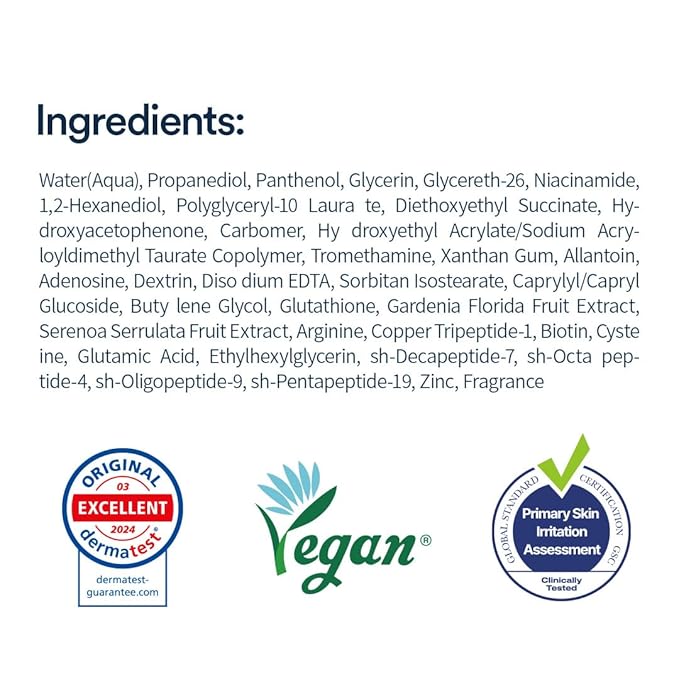 - Special Ingredients : Pepthathenol(Peptide + Panthenol), Vitamin E, Glutathione, Niacinamide, Adenosine