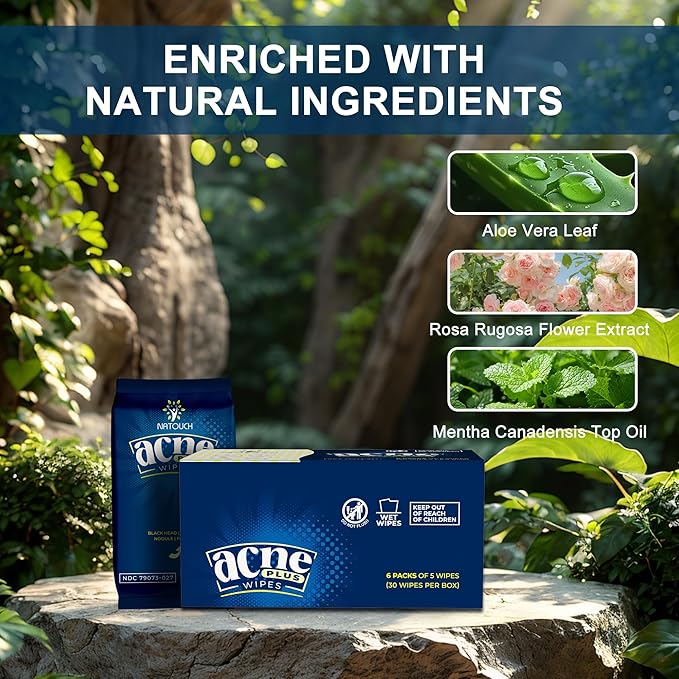 - NATURAL ACNE CLEANSING WIPES: The ingredients to have in wipes enriched with natural ingredients geranium robertianum extract, melaleuca alternifolia leaf extract, aloe vera, centella asiatica extract, rosa rugosa flower extract, and hemsleya amabilis extract. A blend of natural essential oils with a fresh aroma, but also has a good skin healing and antifungal effect