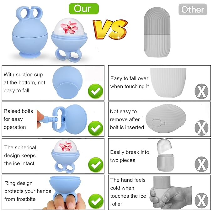 - Unique Finger Ring and Suction Cup Design: Different from the traditional ice roller, our ice face mold has a unique design. Hand ring design: protects your fingers from frostbite while in use, which is more ergonomic. The bottom suction cup design: the facial ice roller is placed more smoothly, which can prevent the face ice roller from being accidentally touched and tipping over causing water leakage.