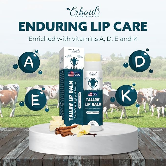 - INTENSELY HYDRATING FORMULA: Immerse your lips in moisture with our grass-fed organic beef tallow lip balm with vanilla cinnamon flavor. Crafted with natural fats, akin to those in human skin, it maintains your lips' moisture barrier for enduring hydration and velvety softness.