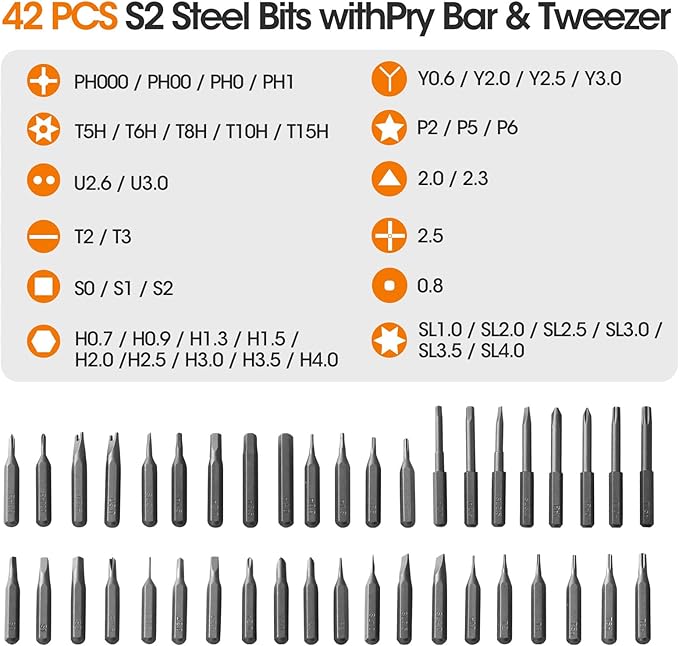 - 【42-in-1 S2 Screwdriver Bits】This precision set comes with 42 bits: 34 regular 28mm ones and 8 longer 39mm bits, so you can handle screws deep or shallow. With 12 different types of bits, it’s got you covered for all kinds of jobs—fixing computers, iPads, watches, cameras, drones, glasses… you name it. Everything’s in one set, so you save space and skip the hunt for the right tool.